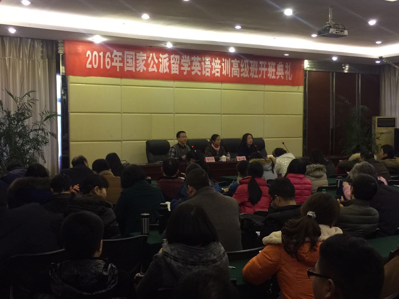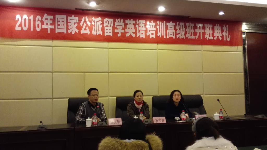 1月12日下午,江西师范大学举行了2016年春季国家公派留学英语培训高级班开班典礼。江西省教育厅张婵处长、江西师范大学饶文华副院长、广东外语外贸大学出国留学培训部杨文慧副院长以及教学工作小组的老师参加了典礼。