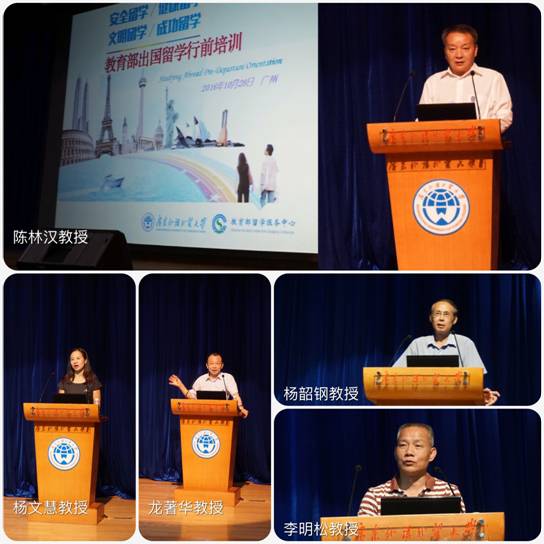 28日的培训由来自各机构的专家团队进行多场精彩讲座,包括南方医科大学李明松教授的“出国人员海外保健及疾病的自我诊断讲座”、我校政治与公共管理学院杨韶刚教授的“海外留学心理问题讲座”、法学院龙著华教授的“欧美国家法规注意事项讲座”、国际学院杨文慧教授的“跨文化交流及外事礼仪讲座”,以及广州留学服务中心工作人员的“公派留学派出手续办理流程及有关规定讲座”。