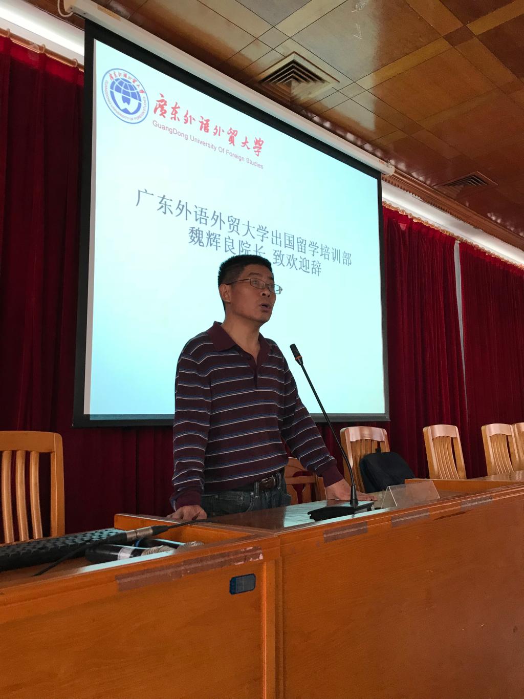 本网讯 2018年3月4日上午10:00,广东外语外贸大学出国留学培训部在国际学院2楼学生活动室举行了2018年春季国家公派访问学者高级英语培训班开班典礼。国际学院/出国留学培训部魏辉良院长、出国留学培训部教研室王勇旗主任、出国留学培训部张海强老师以及本次培训的全体学员参加了开班典礼。
