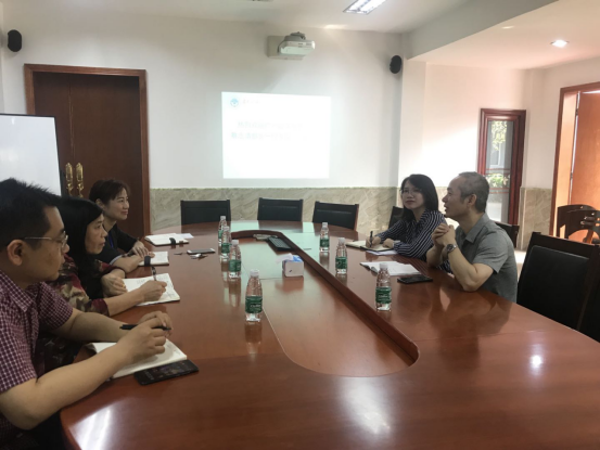 本网讯 2019年10月18日,广州留学服务中心蔡志清部长、梁曼晴老师一行莅临我部就出国留学人员行前培训等事宜进行了调研交流。我部杨文慧副院长、教研室王勇旗主任、办公室张海强主任、曾令琼老师参加了交流会议。会议之前,在杨院长的介绍、陪同下,蔡部长参观了我部的教学、办公环境。