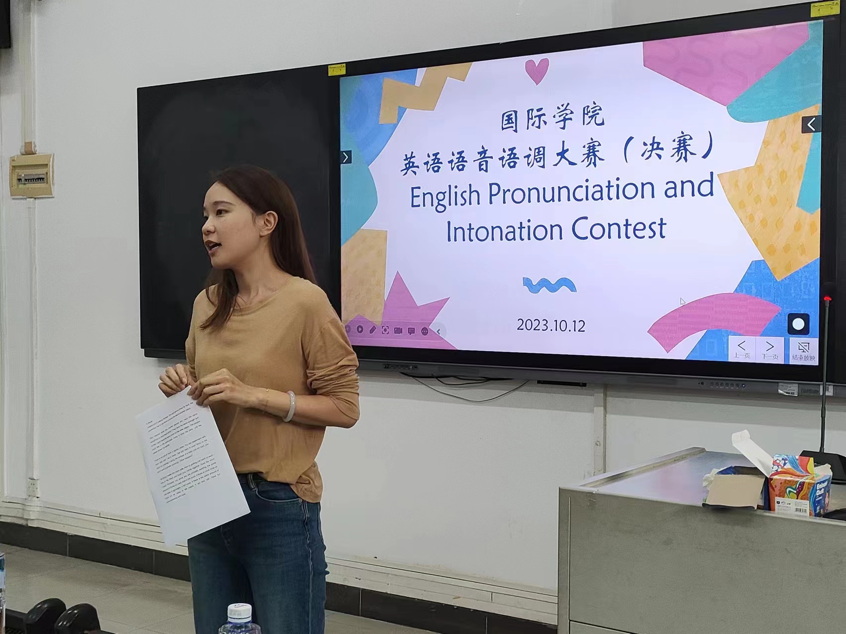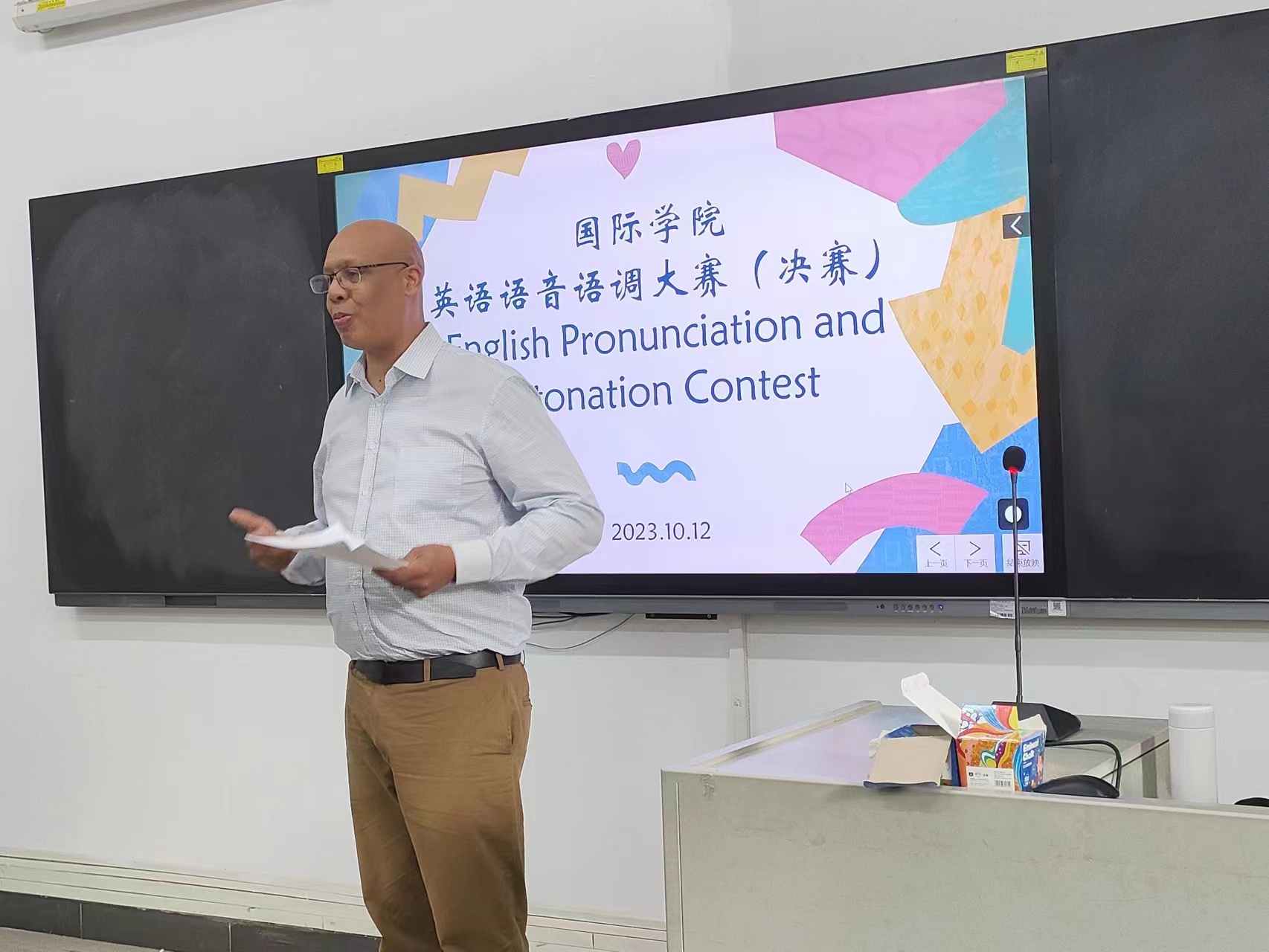 10月12日下午,广东外语外贸大学国际学院英语语音语调大赛决赛于C104教室举行,从初赛脱颖而出的10名选手将同台比拼。国际学院教师陈斌、黄钰棋、外教Enic担任了本次大赛的评委。