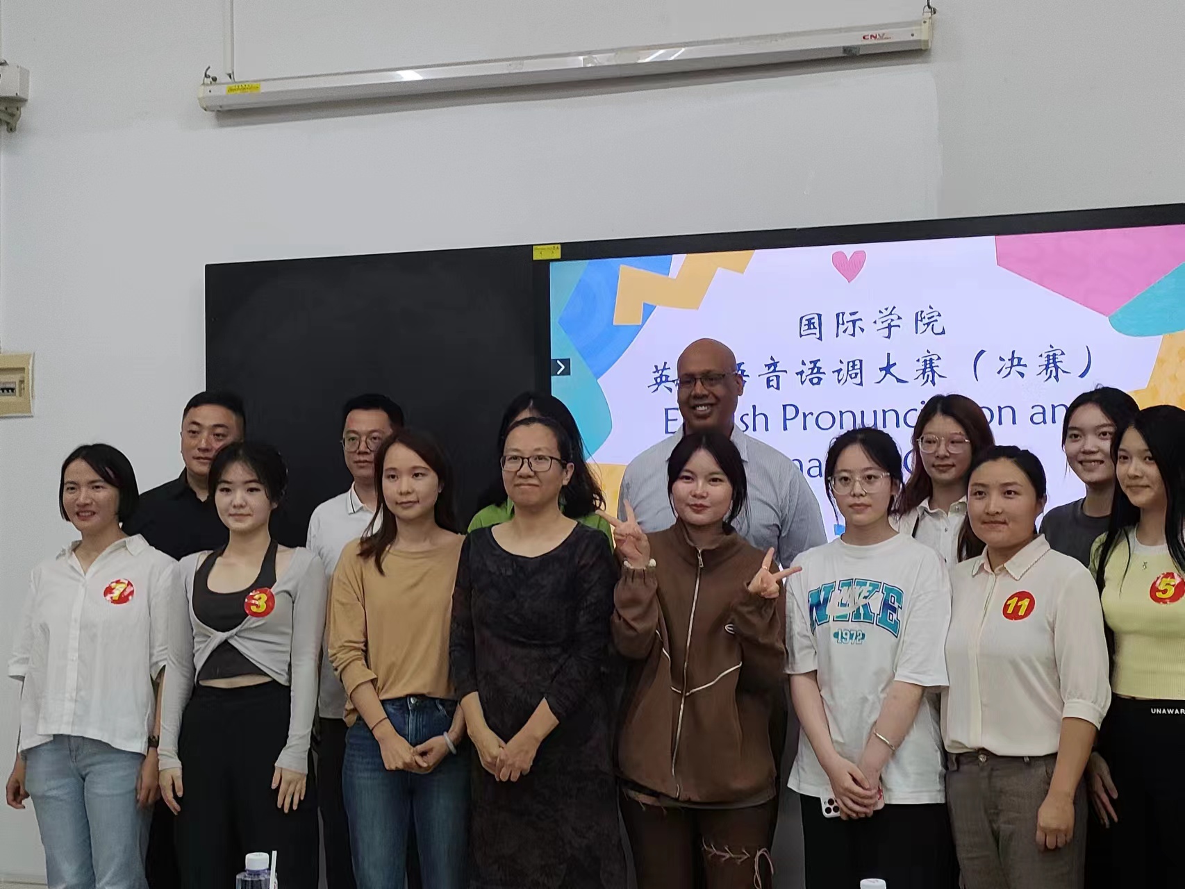 最后,主持人公布获奖选手名单。评委老师与选手们合影留念。祝贺我部学员在英语语音语调大赛决赛获得佳绩。