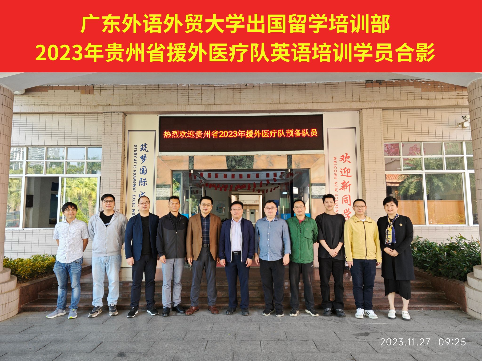 仪式最后,与会人员还就我院的国际项目及公派项目开展了简单交流及合影留念。据悉,本次培训的学员是贵州省外派至所罗门群岛的第三批医疗队,也是第二批派出至广外进行援外医疗英语培训的学员。学员将在广外培训部进行为期7周的医学英语培训,于明年初前往所罗门群岛执行医疗任务。祝愿各位学员能够攻克语言难关,持续提高业务能力,成为一支优秀的援外队伍,不负韶华,不辱使命!