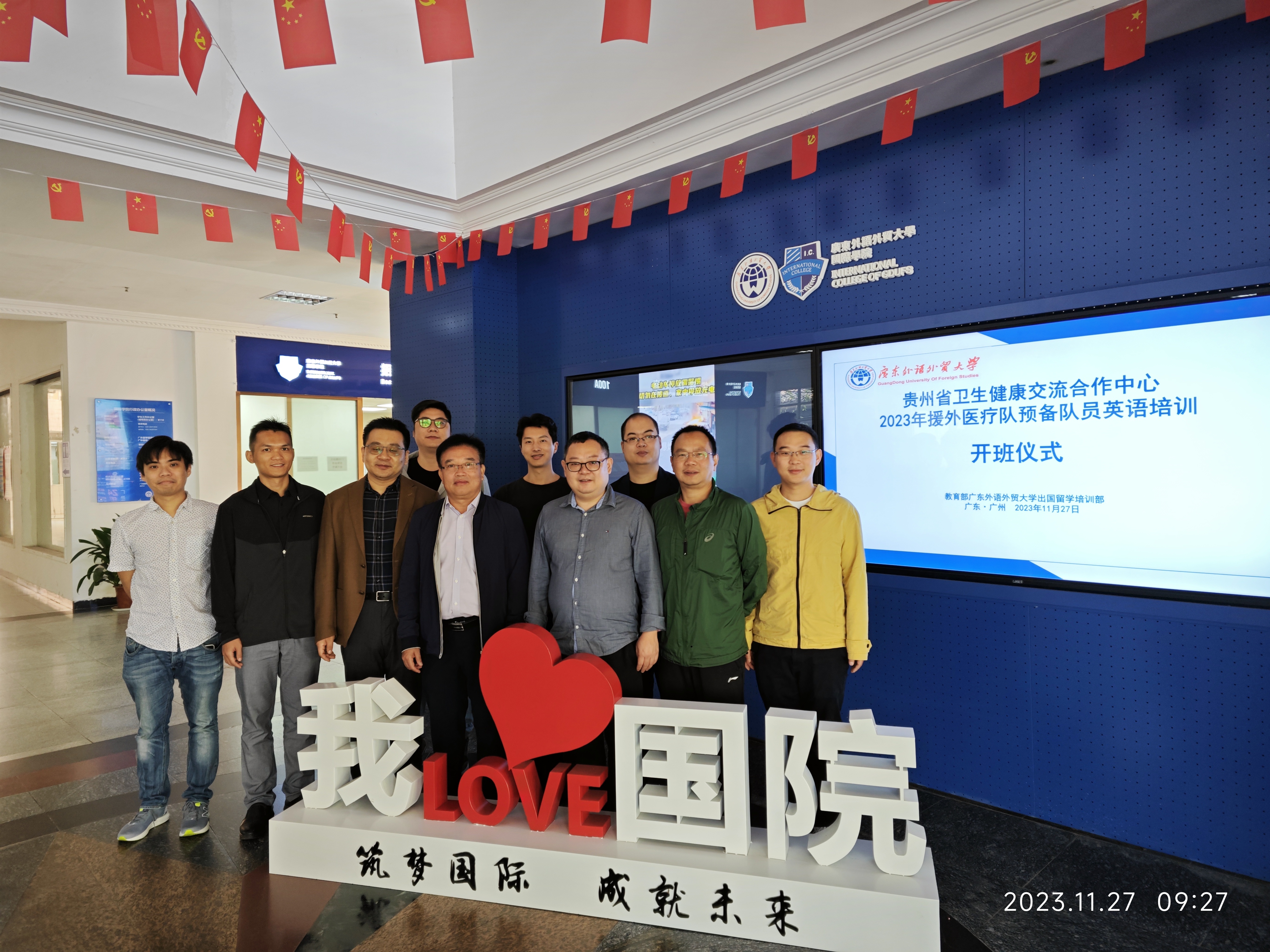 2023年是中国援外医疗队派遣60周年。牢记初心使命,发扬国际人道主义精神,用仁心仁术书写大爱担当。2023年11月27日上午9:00,贵州省2023年援外医疗队英语培训开班仪式在广东外语外贸大学国际学院(出国留学培训部)A103会议室进行。我院党委书记谢应东、院长助理王勇旗、党政办公室主任张辉金、培训部办公室主任张海强、培训班主任洪雪玲以及参加本次培训的全体学员出席参加了仪式。会议由王勇旗院长助理主持。
