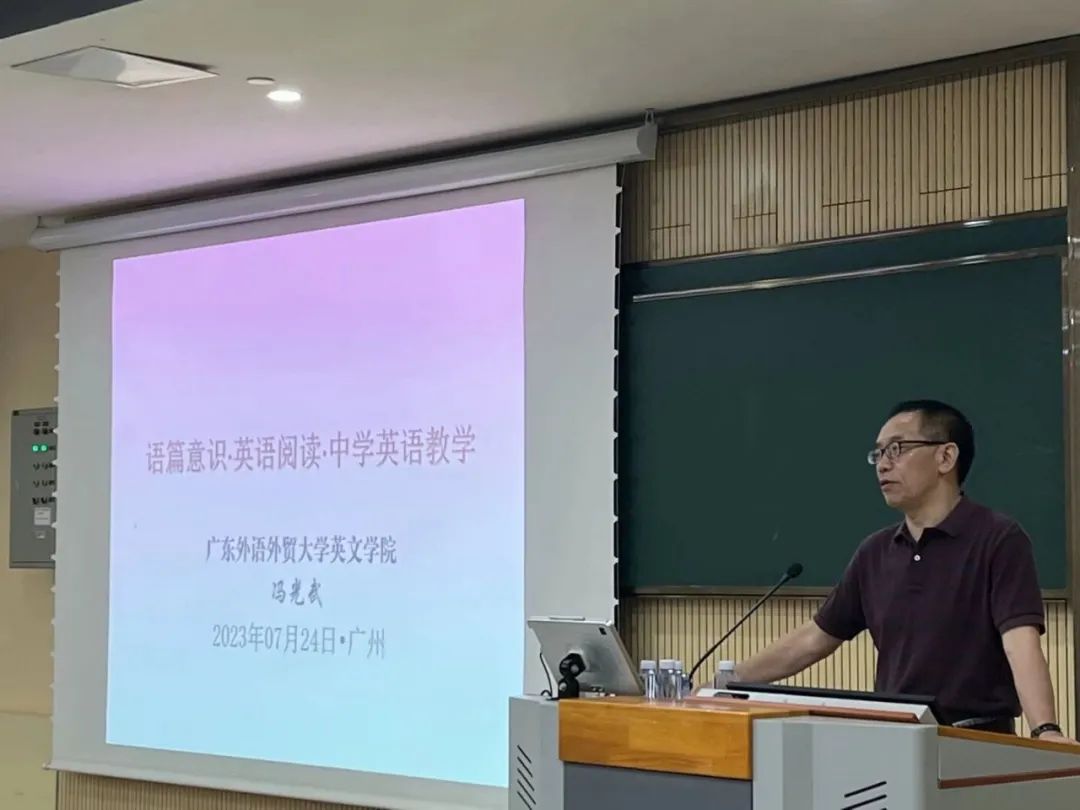 开班仪式后第一场大讲堂立即开讲,广外英文学院的博士生导师冯光武教授为学员带来“语篇意识和中学英语教学”讲座。冯光武教授从语篇意识的内涵从发,深入浅出地解释语篇意识在英语学习中的重要性,用详实的例子展示如何培养语篇意识,分步骤讲解如何根据不同的文章体裁进行语篇教学。