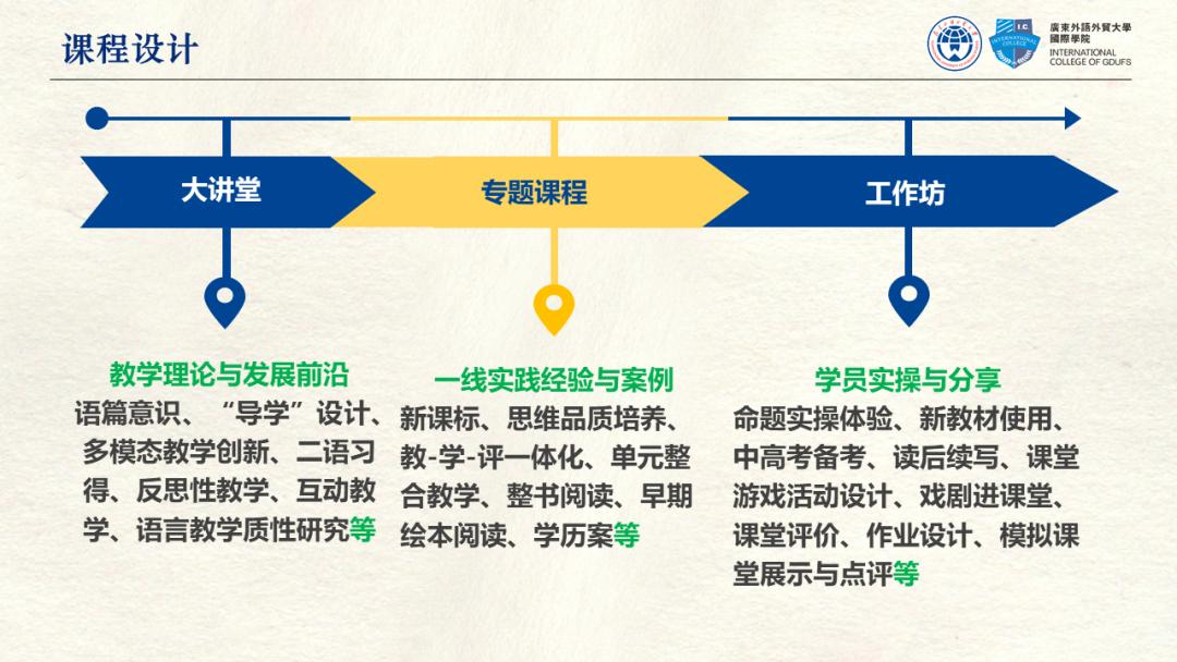 广外培训部院长助理王勇旗详细介绍了课程安排,本次培训将大讲堂、专题课程和工作坊三种类型课程的结合,邀请到众多英语教育领域专家和一线教研员与骨干教师主讲,希望学员们不虚此行。