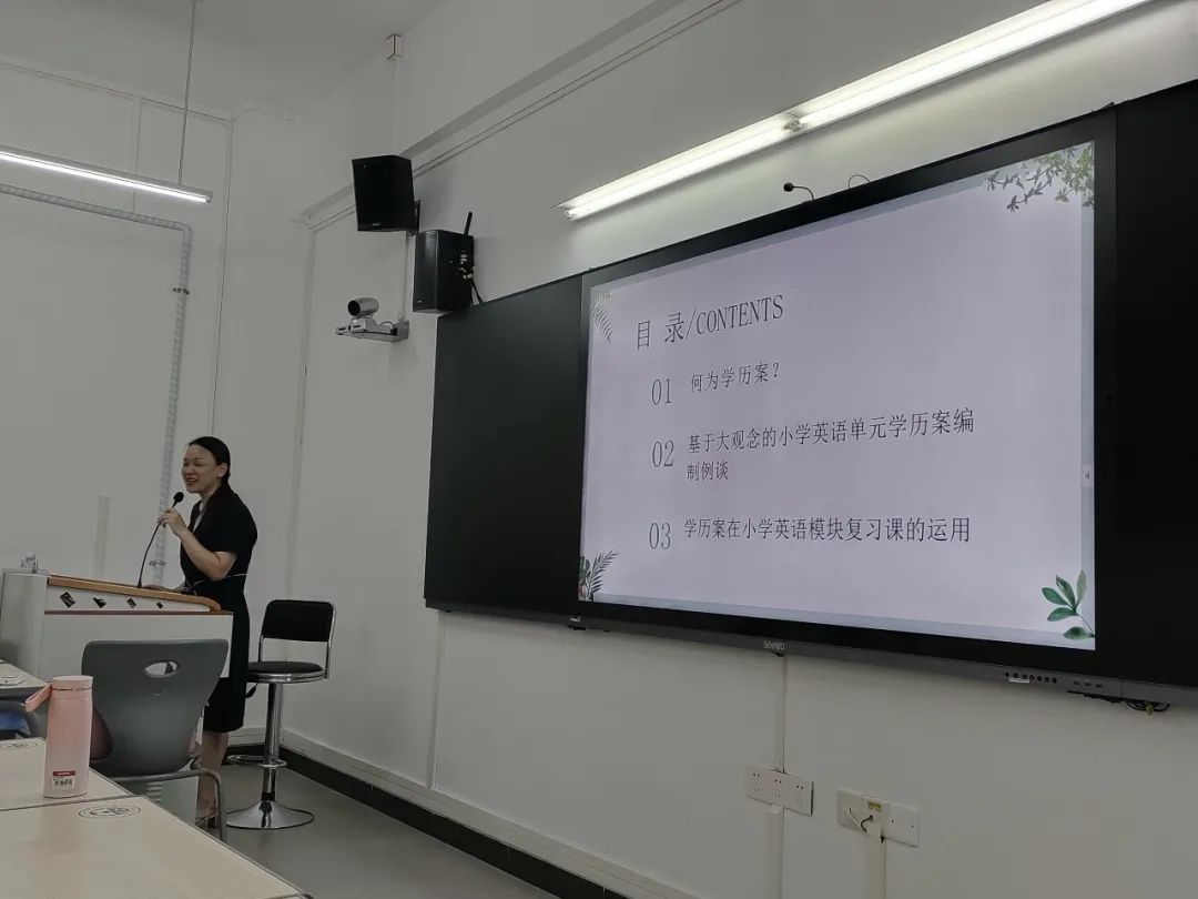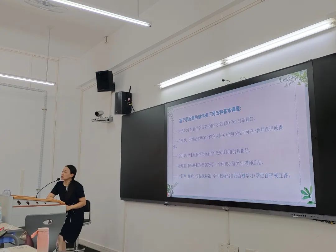 赖燕英老师在课堂上基于“学历案”这一新型课堂学习方案,强调“学主教从、先学后教、以学定教”,并通过实际教案分享、录制的课程视频作为具体案例,向学员们分享教学实践经验。