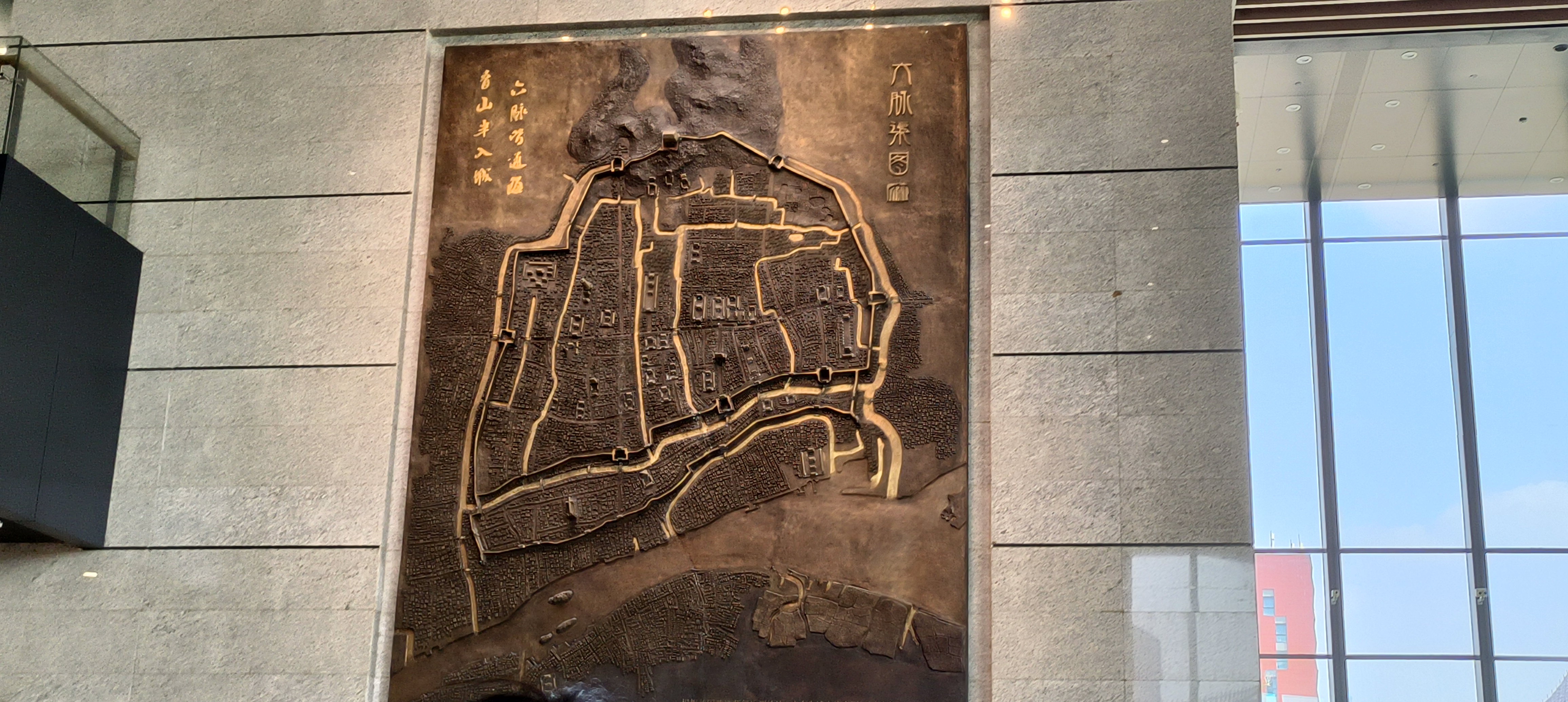进入展览中心后,在工作人员的指引下我们观看了“广州•生长的天际线”影片。影片和上方的城市肌理变迁图在时间轴上是相呼应的,可以通过上下联动的方式一起来进行观看,它们共同为大家展示了广州从2200多年前的古城到现如今现代化大都市的变化历程。讲解员还为我们介绍了铜铸浮雕“六脉渠图”,浮雕真实地呈现了广州在1918年拆除城墙之前的城市格局。