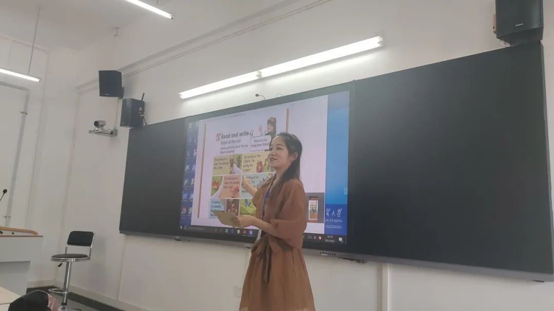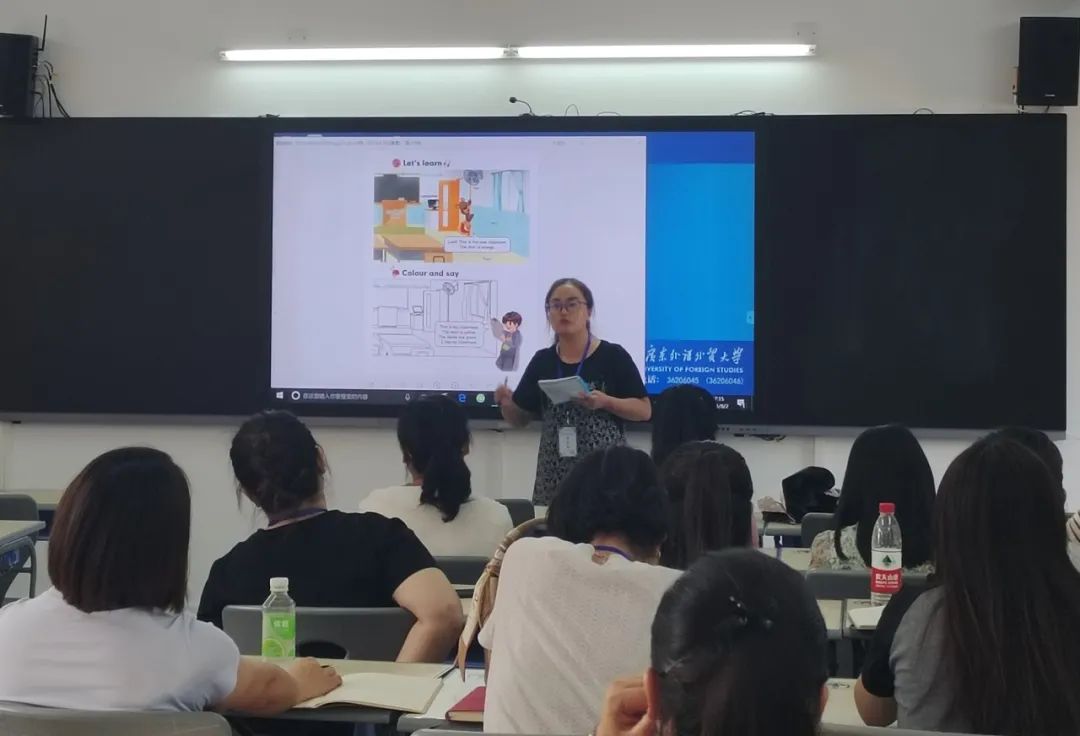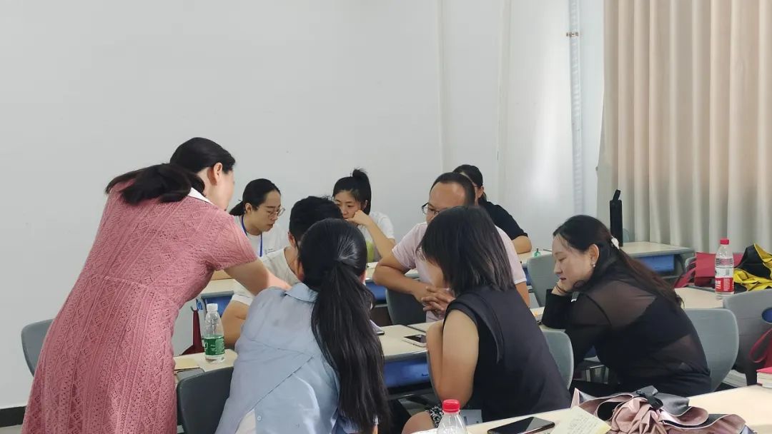 在下午的课程工作坊上,学员们组成小组进行讨论,共同完成“用拼读的方法教新单词”这一设计任务,并派小组代表进行汇报。学员们积极热情地讨论,踊跃进行汇报分享。