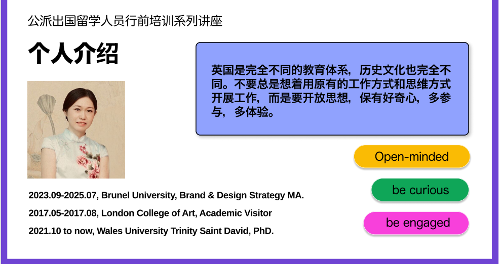 广州美术学院的卢文英博士以其在英国留学期间的亲身体验为基础,详细讲解了出发前的准备工作、国外的报道流程、参加海外的学术活动的注意事项,此外,卢文英博士讲述了如何安排留学期间的假期,如何在科研工作与个人生活之间取得平衡。她鼓励留学生坚持锻炼,同时积极参与当地文化活动,保持良好的身体和心理健康。