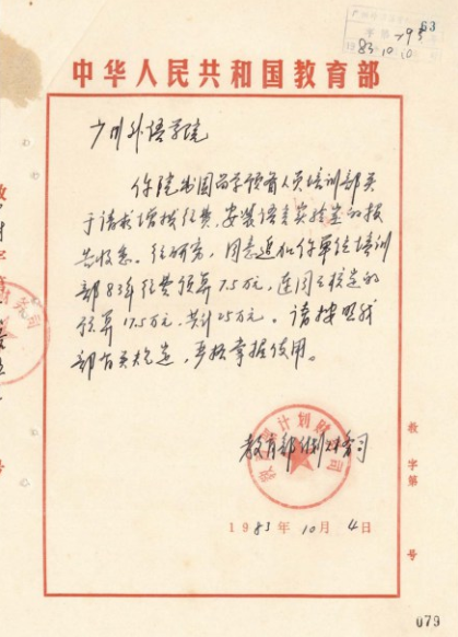 原广州外国语学院(现广东外语外贸大学)受教育部指示,成立育部直属出国留学预备人员培训部(现教育部出国留学培训部)。